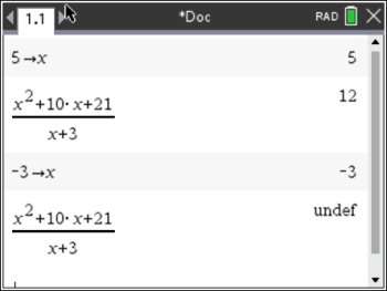 The calculator can verify whether a value you pick creates a zero denominator, by stating that the answer is "undefined" (undef).