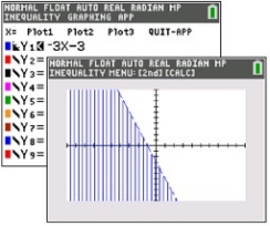 The draw back to this method is that the calculator will not distinguish between a solid line (for >) and a dotted line (for >) on the graph. All calculator lines are solid. You will need to know when to use solid versus dotted lines.